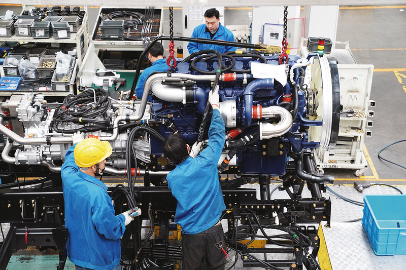 员工正在装配动力总成系统