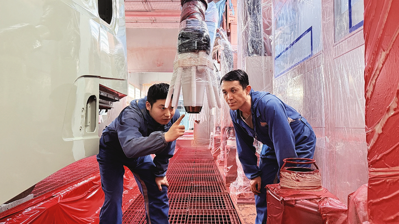 中涂是驾驶室防腐与面漆发色的枢纽。为防管路堵塞,机器人每喷涂完一辆车便要进行溶剂清洗。这延续已久的5秒“标准动作”,却被日常盯线的韩银选看出了端倪,他找来喷漆室骨干吴春博探讨:清洗末期流出的液体已十分清澈,以日产260辆车计,日积月累的流失成本惊人。“只要质量不降,时间还能往下压。”两人一拍即合,萌生了工艺“瘦身”的念头。